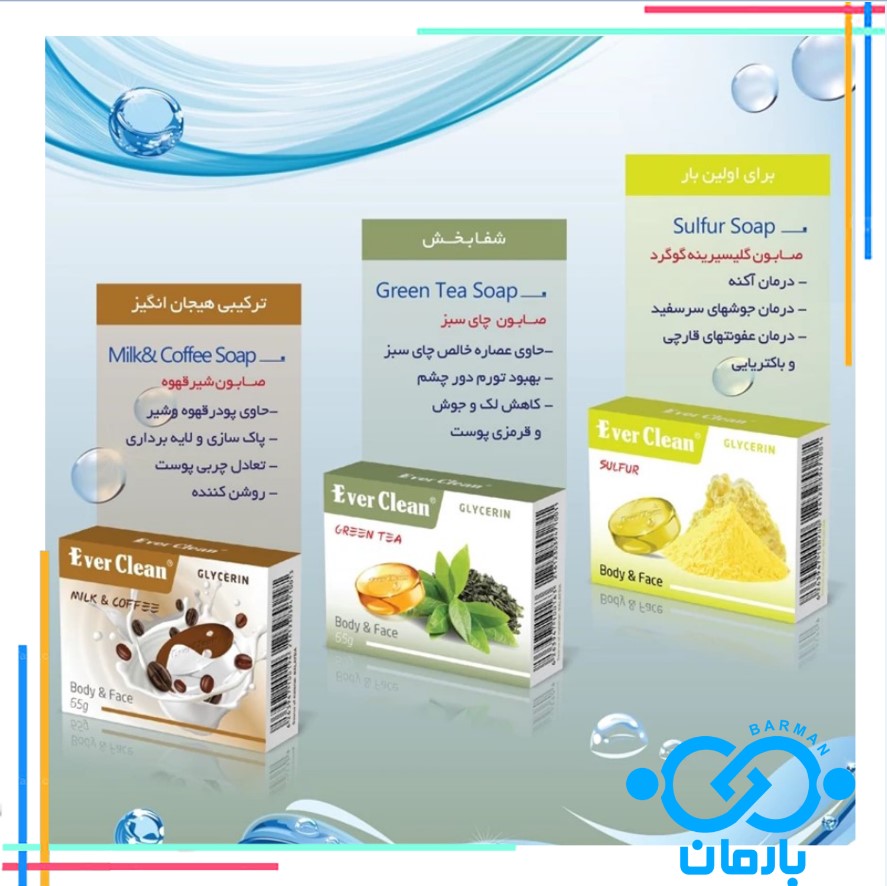 صابون درخت چای ever clean -بهبود تورم دور چشم -کاهش لک و جوش و قرمزی پوست -دارای عصاری خالص چای سبز قابل استفاده جهت استعمال خارجی پوست بدن و صورت.